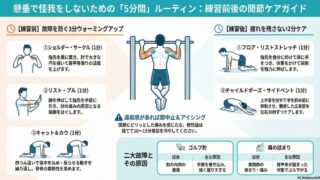 懸垂トレーニングの環境構築と基本ルール懸垂のウォーミングアップ決定版!肩や肘を壊さない正しいやり方と練習後のケア方法 懸垂初心者必見!いきなりぶら下がるのは、肘や肩を痛め挫折する最大の原因です。本記事では、怪我を防ぎ最短で0回を脱出するための「3分準備運動」と「2分ケア」を解説。関節の仕組みや痛みの見分け方を知り、安全に一生モノの背中を手に入れましょう。 2026.02.06懸垂トレーニングの環境構築と基本ルール