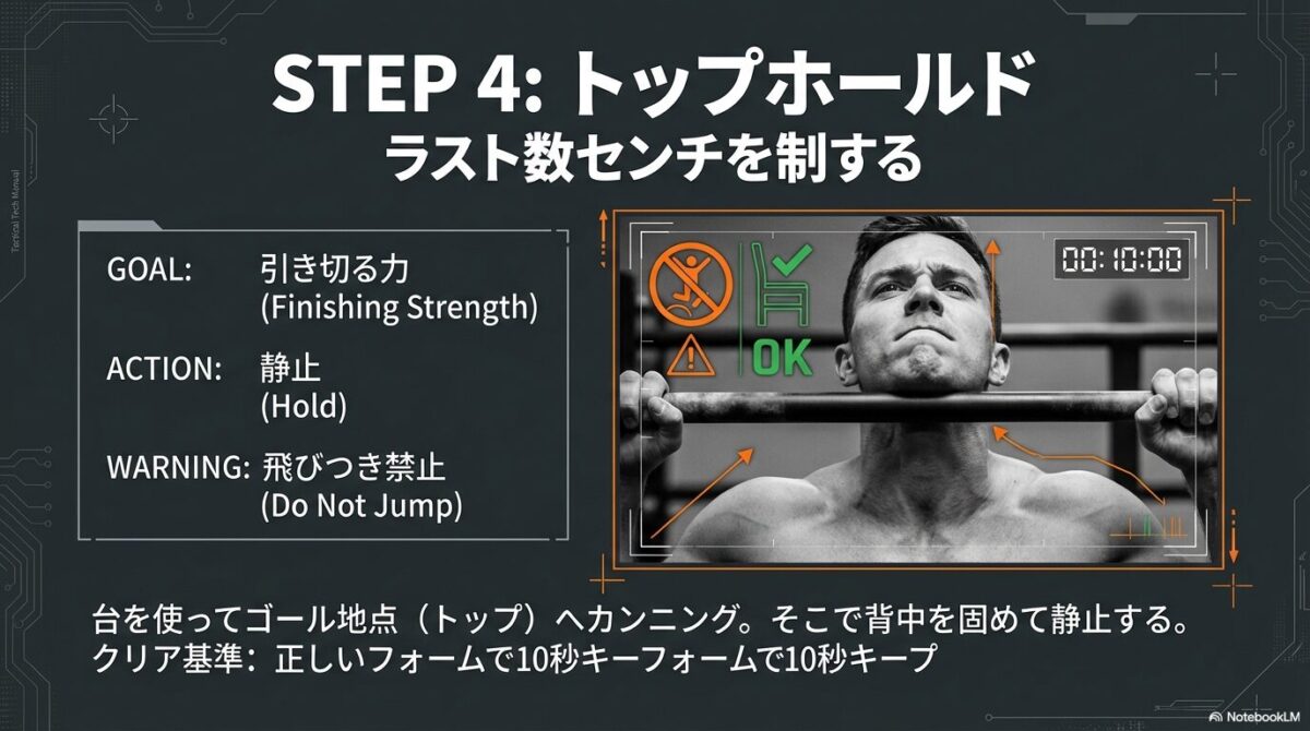完璧なフォームで「連続10回」できるようになったら、次のステップである「トップ・ホールド(鉄棒の上でアゴをキープする練習)」の練習を開始してもOKです。