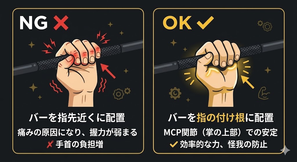 正しい握り位置は、バーが手のひらと指の境目(MCP関節=第3関節のあたり)に当たる位置です。