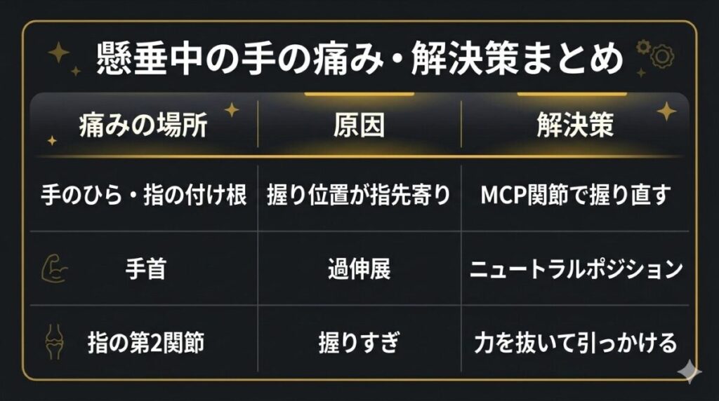 手のひらや指の付け根が痛くなるのは、懸垂で最もよくある手の痛みです。「パワーグリップ」で対処することもできますが、まず握り方を見直すだけで大きく改善します。