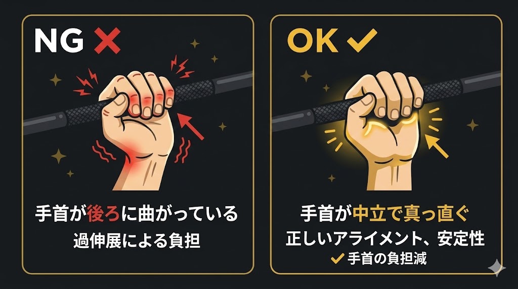 バーを握る際に手首が過度に反り返っている(背屈している)状態を「過伸展」といいます。懸垂で体を引き上げる動作の中で手首が反ってしまうと、手根関節に大きな負荷がかかり続け、慢性的な痛みの原因になります。